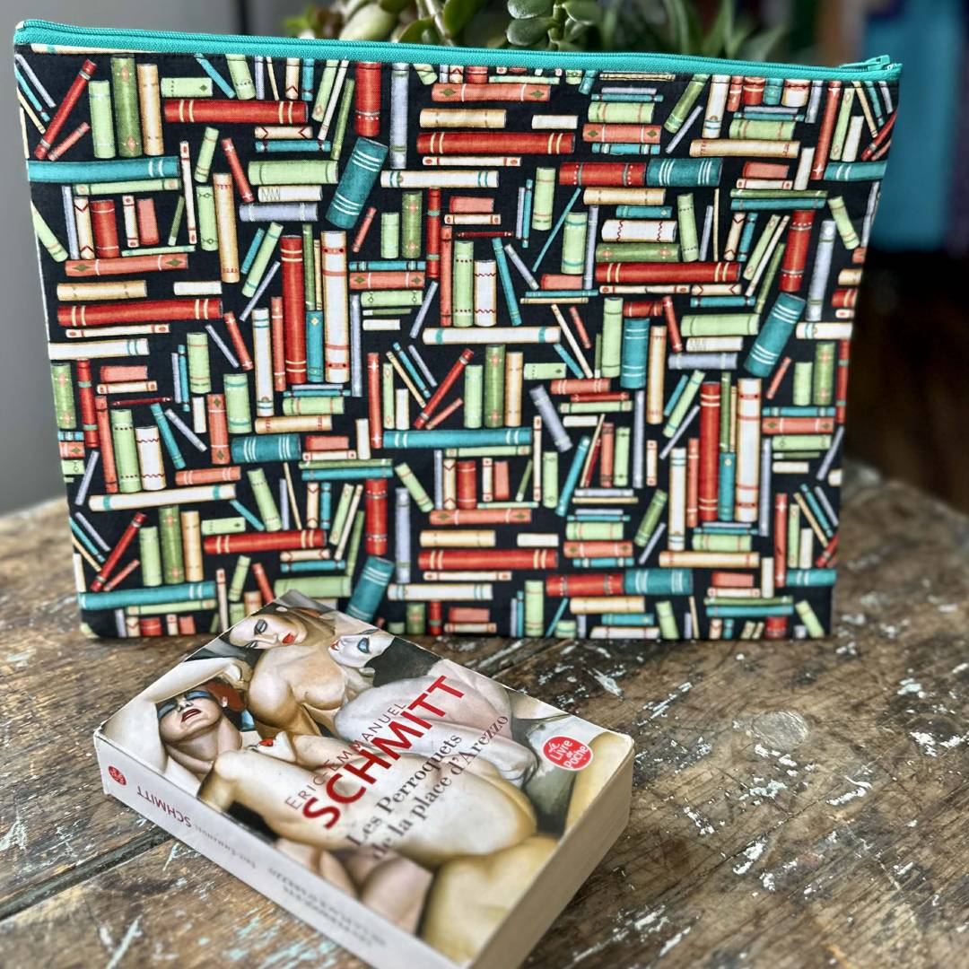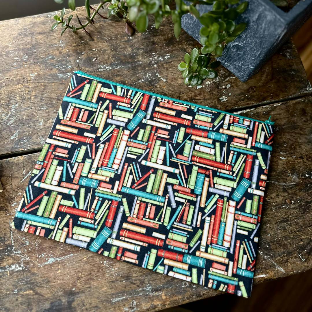 Cette très grande enveloppe en tissu à fermeture éclaire arbore un motif de livres colorés. Sa finition intérieure est de couleur turquoise. Elle mesure 14 par 11 pouces*. On peut donc facilement y glisser à l’intérieur un Atlas ou un grand livre de recettes. Elle est parfaite pour remplacer l’enveloppe de plastique demandée dans la liste des effets scolaires de vos tous petits.