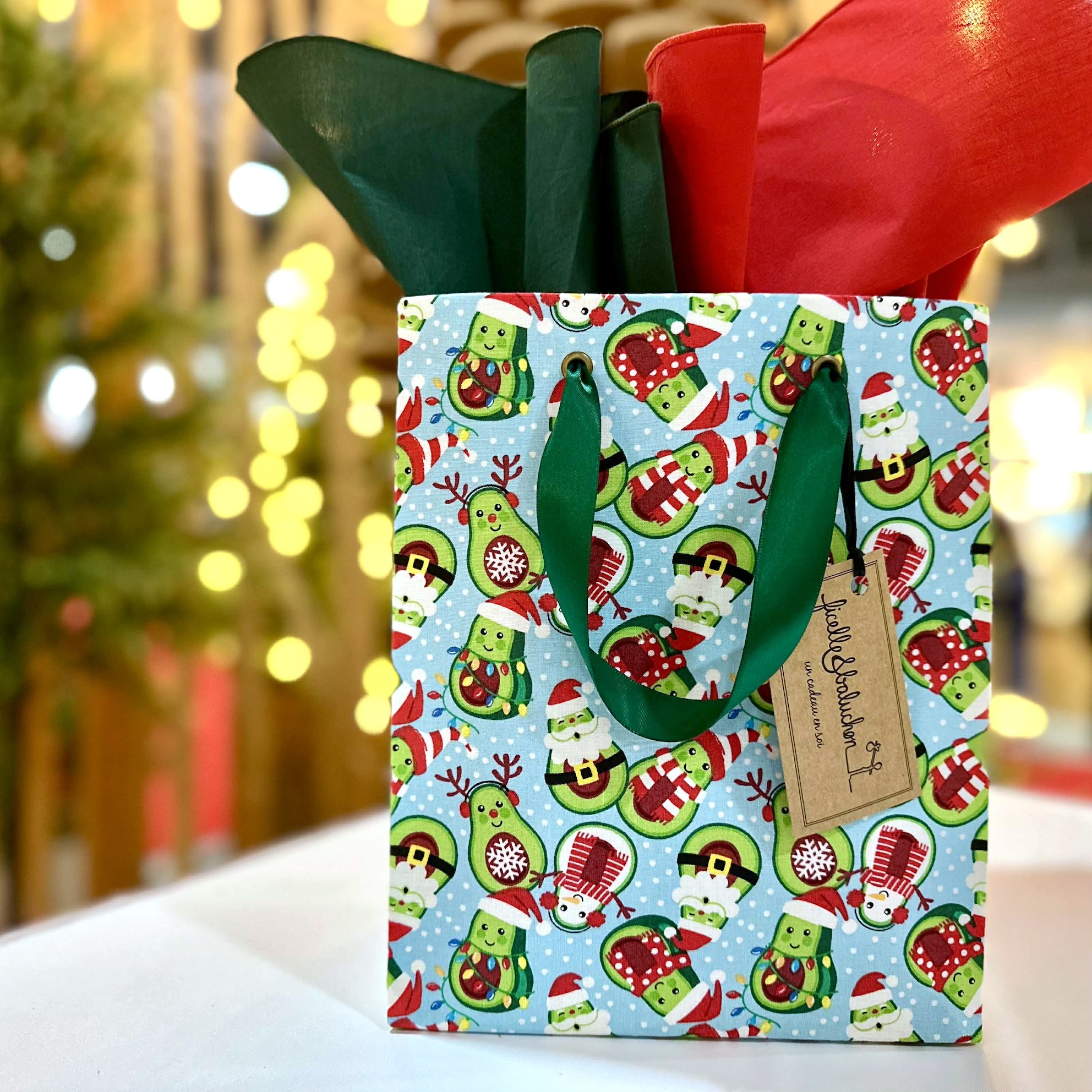 Ce moyen sac cadeau réutilisable en tissu arbore un motif d’avocats de noël et sa finition intérieure est de couleur rouge. Il mesure 11(L) x 9(l) x 4.5(p) pouces*. Il peut donc facilement emballer l’équivalent de deux verres à vin sur pied ou d’un roman.