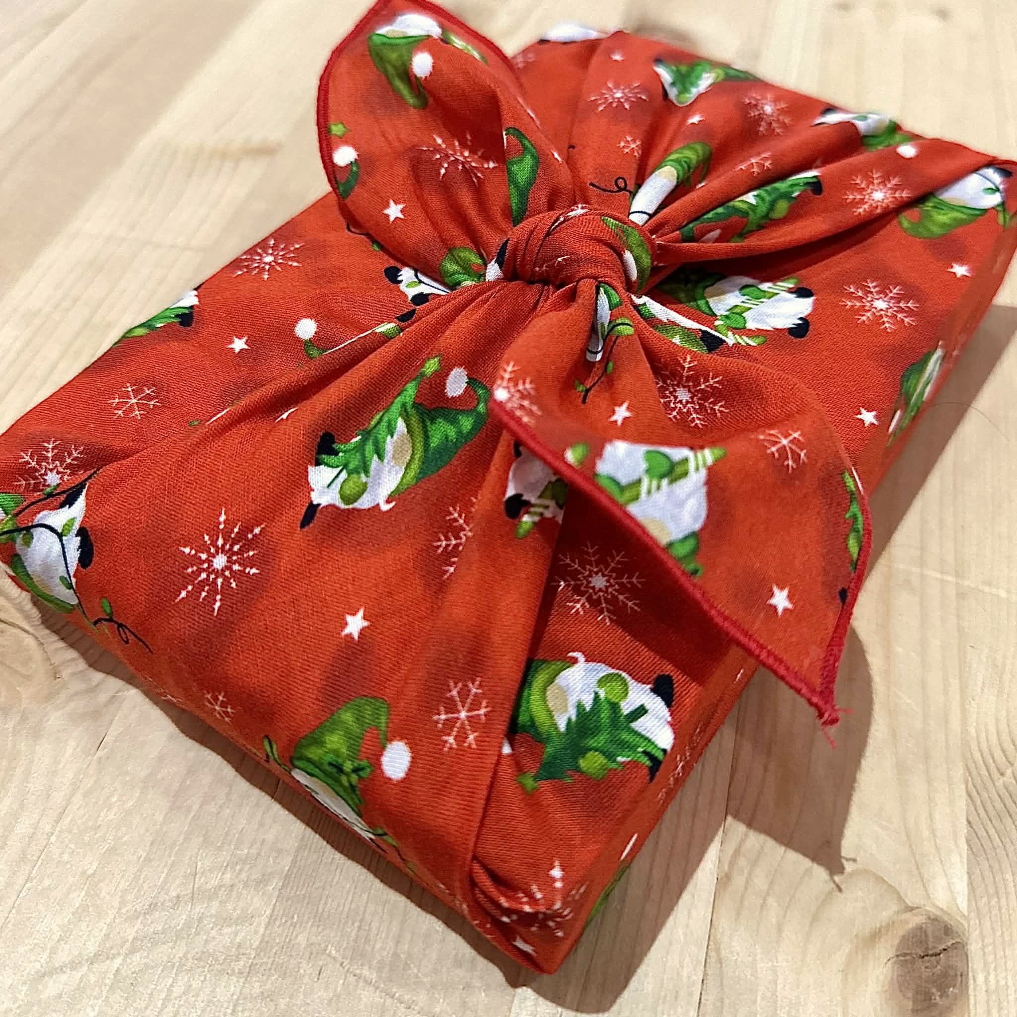 Ce petit furoshiki arbore un motif de gnomes de noël sur fond rouge. Il mesure 20 par 20 pouces*. Il peut donc facilement emballer l’équivalent de deux romans de poche ou d’une tasse à café.
