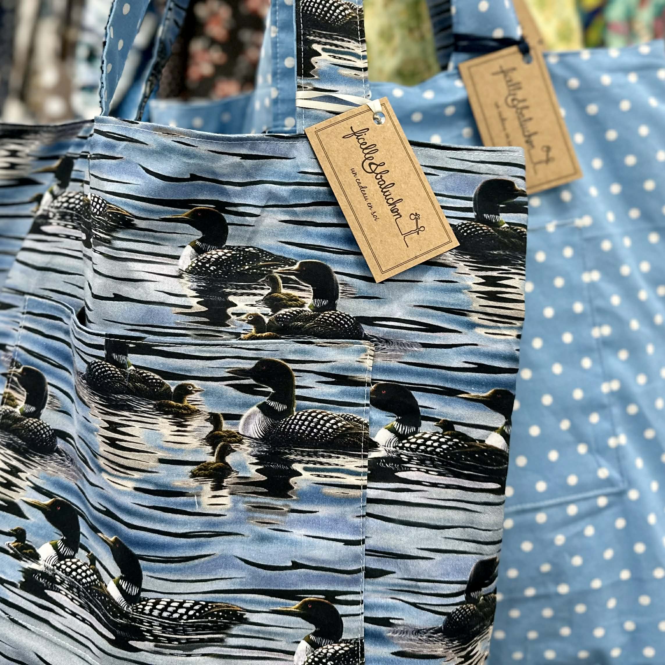 Ce sac fourre-tout réversible en tissu arbore d’un côté un motif de huards et de l’autre, un motif bleu à pois blancs. Il mesure 16(L) x 12(l) x 5(p) pouces*. À titre d’exemple, deux boîtes à souliers y entrent facilement.