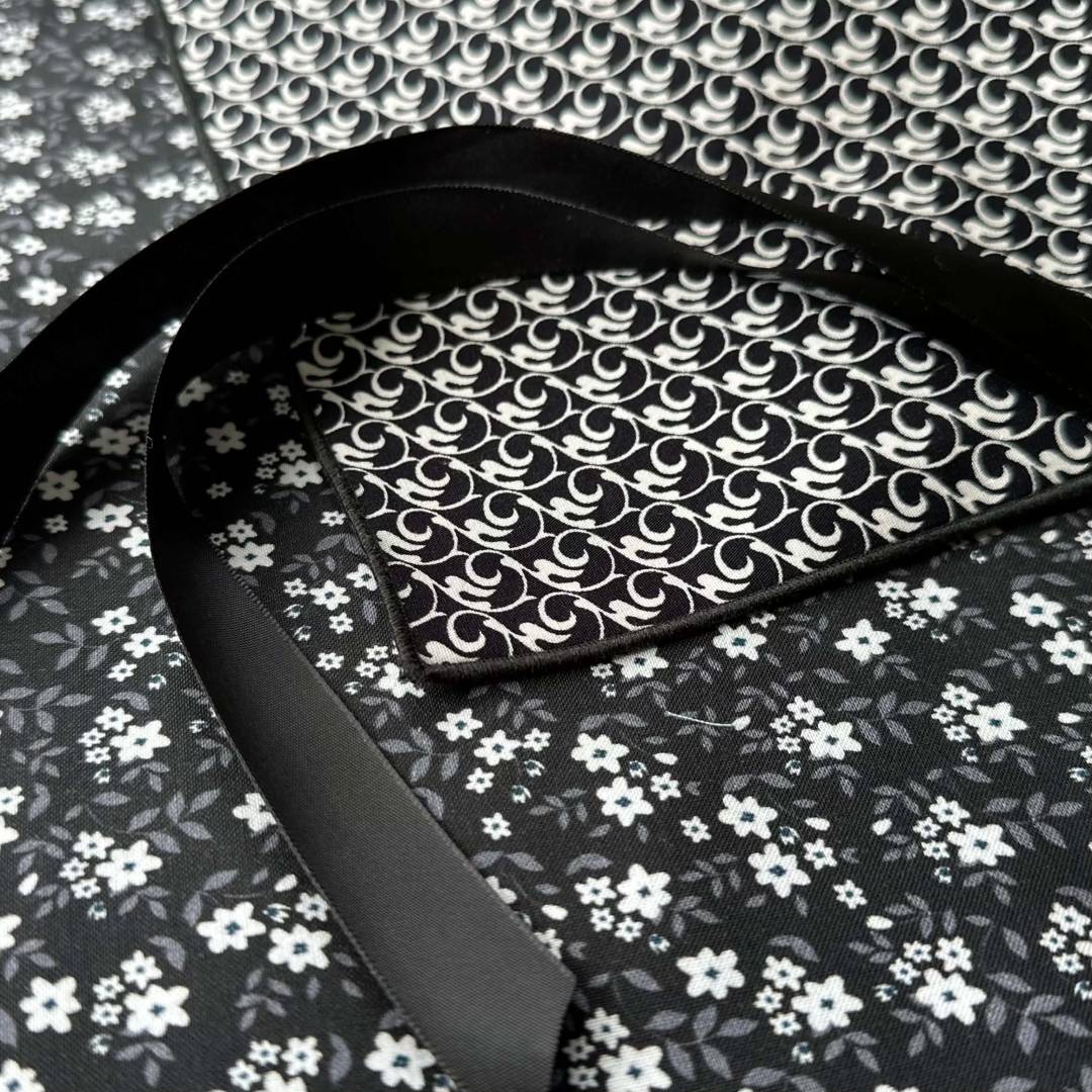 This small reversible gift wrapping fabric features a white and grey floral pattern on a black background on one side and a white spirals pattern on a black background on the other. It measures 20 by 20 inches*. It can therefore easily pack the equivalent of two paperback novels or a coffee mug.