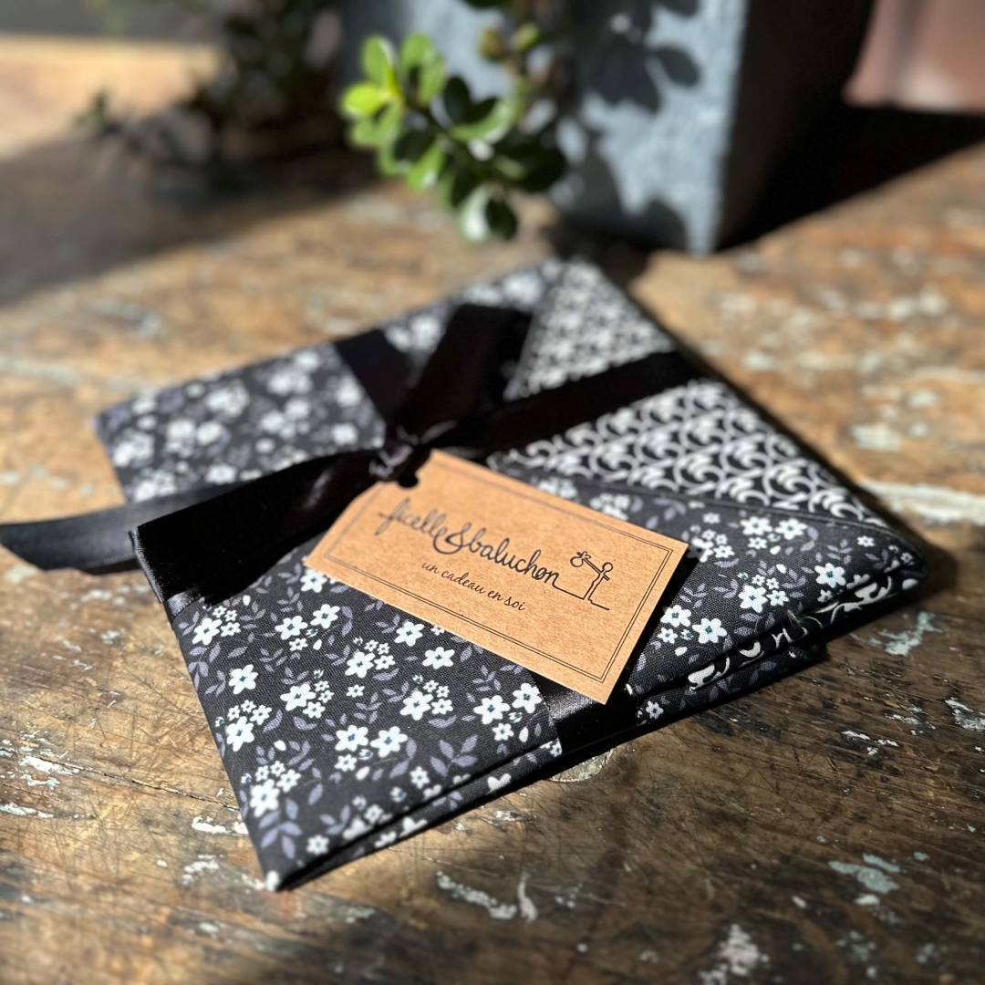 Our reversible wrapping fabrics have been thought out, developed and designed by hand in Quebec (Canada). All the manufacturing steps have been carefully thought out in order to offer you a superior quality product that will last over time. Ils sont faits de deux épaisseurs de 100% coton de qualité courtepointe, fixé un à l’autre afin d’assurer une stabilité. To add a touch of elegance, each wrap fabric is embellished with a satin ribbon that perfectly matches the designs shown. Everything has been thought out to make your life easier. This ribbon was affixed directly to the center of the packaging using an eyelet. All you have to do is pass the ribbon (previously bevelled) through the eyelet if you want to change the pattern. The eyelet is also very practical for inserting a blackboard-style wooden label. In order to ensure a beautiful finish, the perimeter of the packaging is rolled. The result is such that the gift wrapping is a gift in itself.