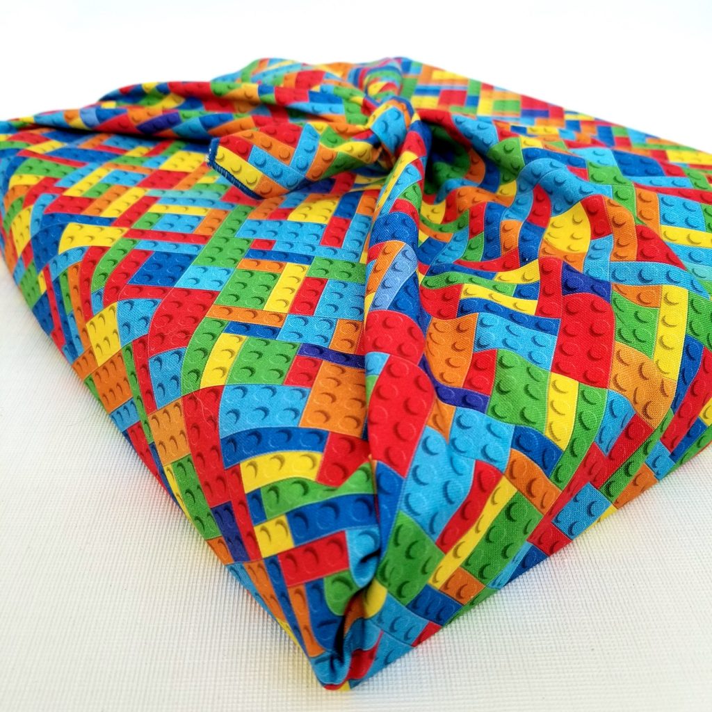 This medium furoshiki features a pattern of green, red, blue, orange, yellow and turquoise building blocks. It measures 30 by 30 inches*. It can therefore easily pack the equivalent of a board game or a shoebox.