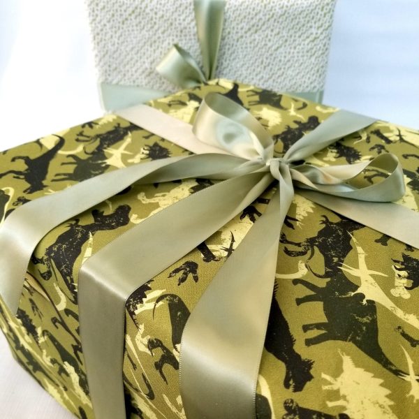This large reversible wrapping fabric features a dinosaur pattern on one side and a garland pattern of green circles on the other. It measures 40 by 40 inches*. It can therefore easily pack the equivalent of a case of milk or a food processor.