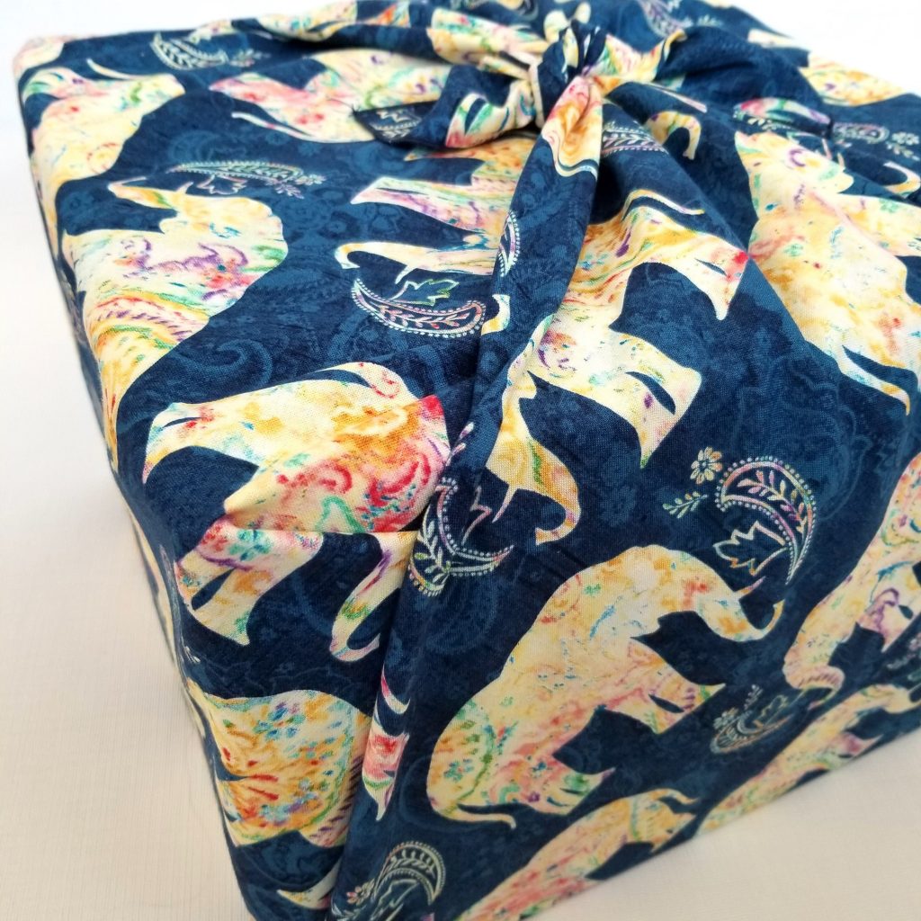 This large furoshiki features a pattern of elephants. It measures 40 by 40 inches*. It can therefore easily pack the equivalent of a case of milk or a food processor.