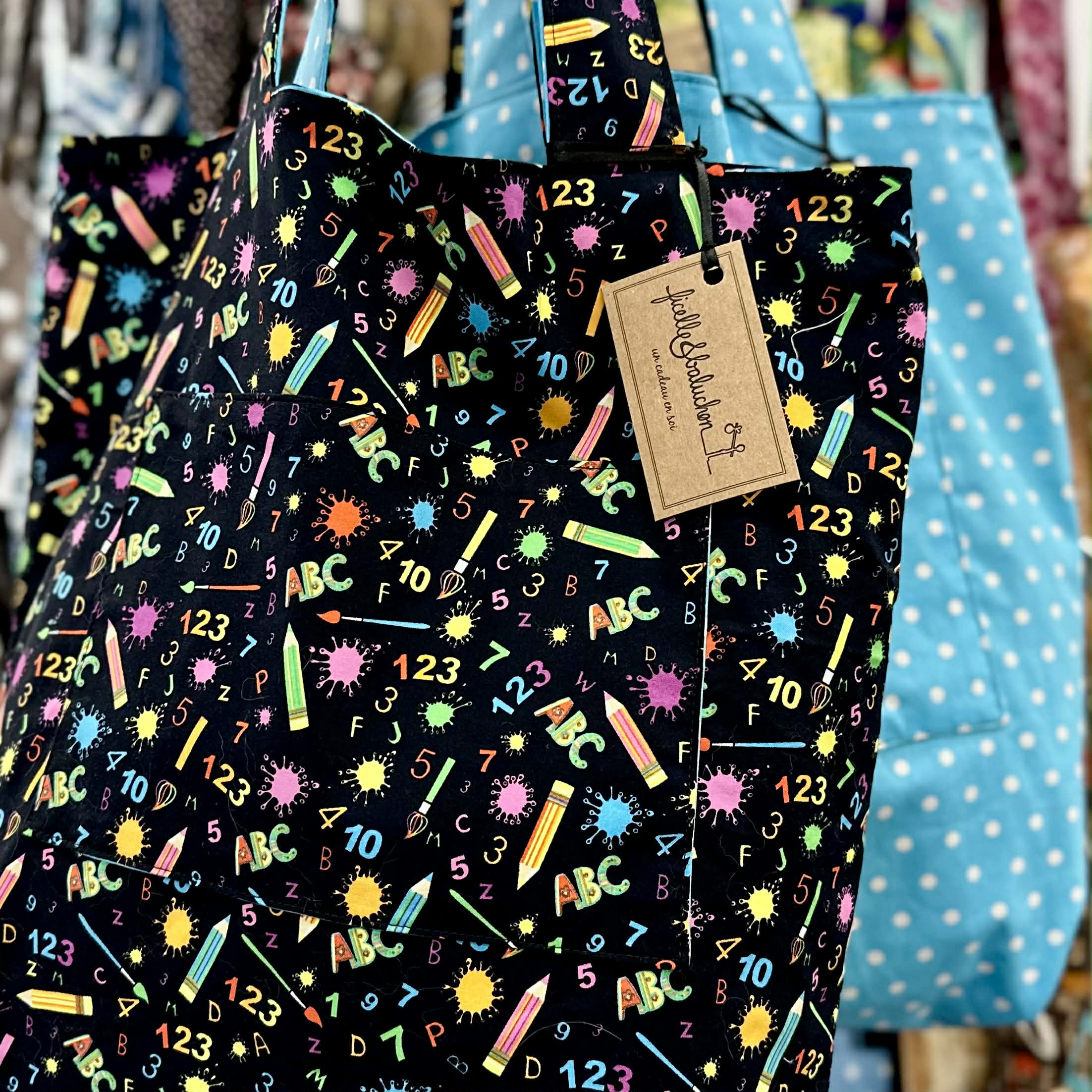 This reversible fabric tote bag features a pencils, letters, and numbers pattern on a black background on one side and on the other, a turquoise blue pattern with white polka dots. It measures 16(L) x 12(W) x 5(D) inches*. For example, two shoeboxes can easily fit inside.