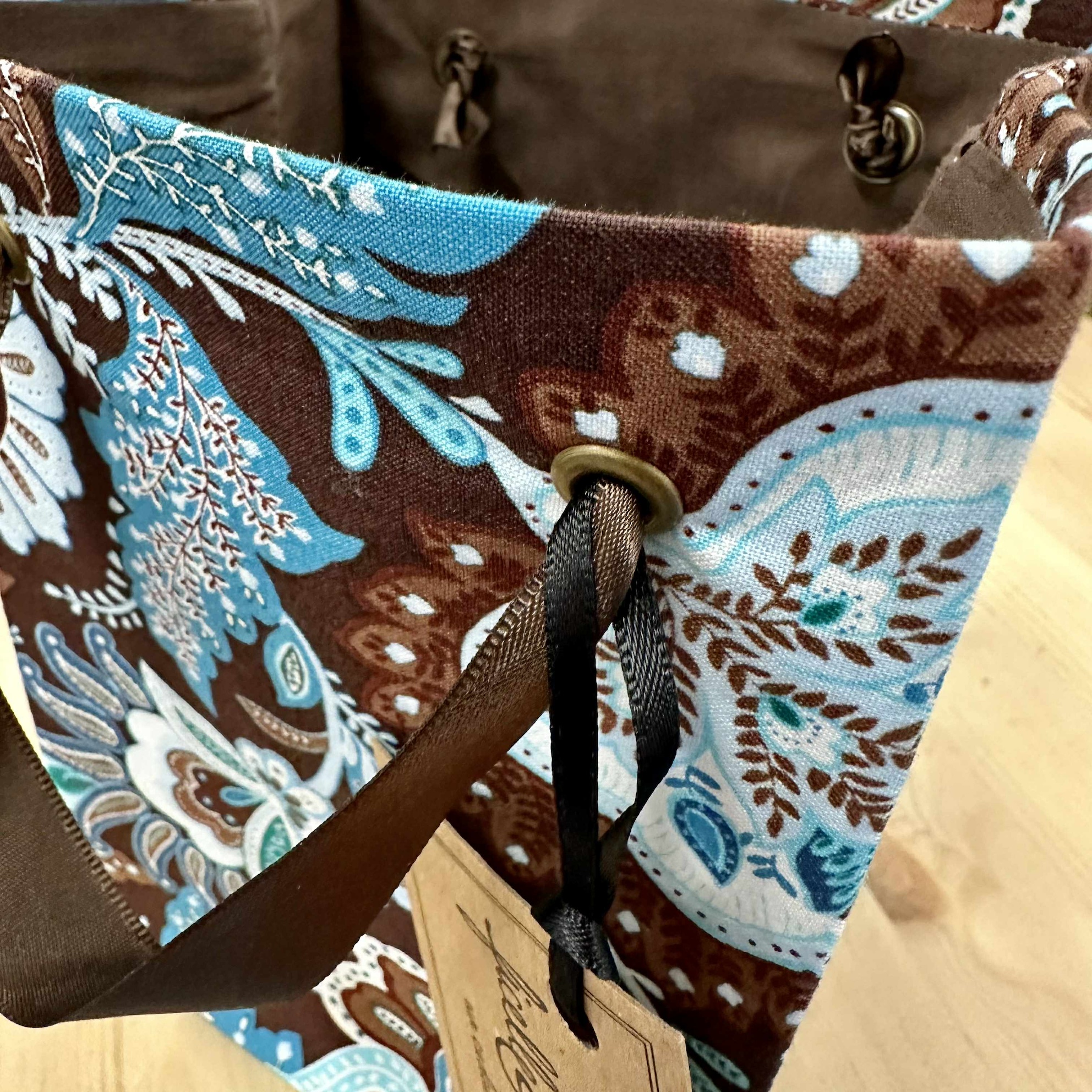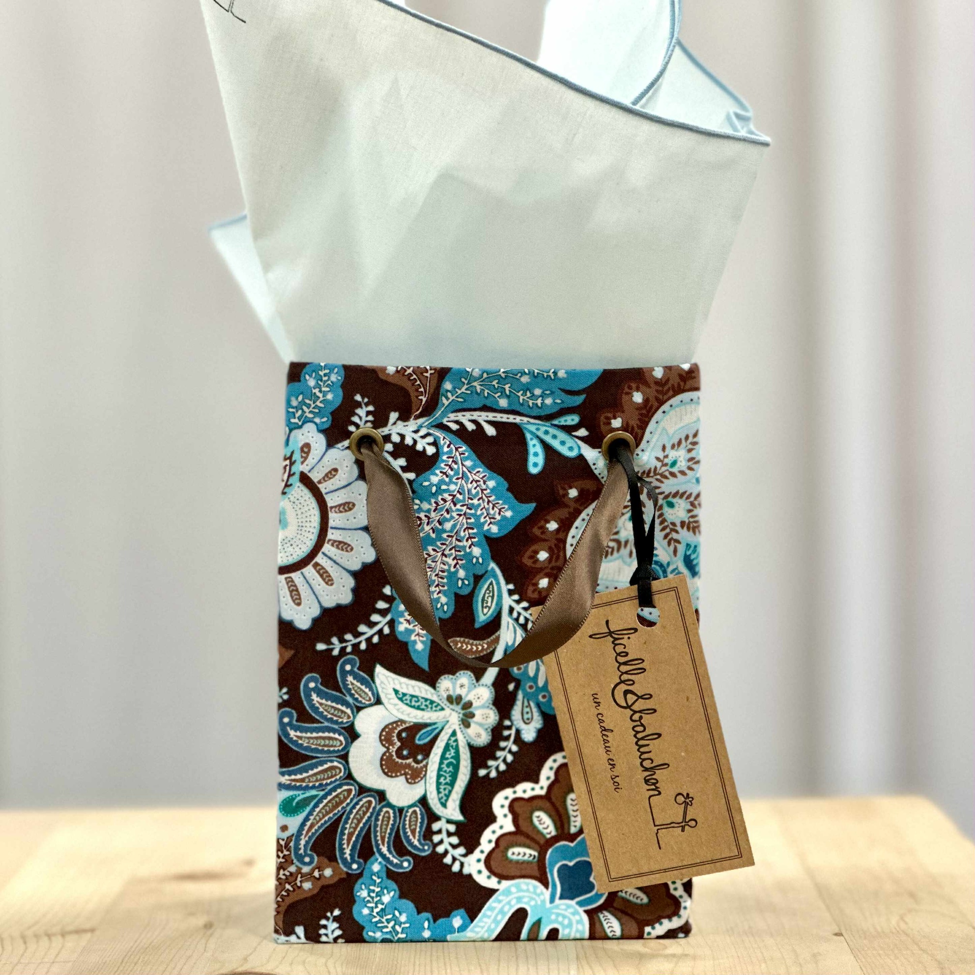 This small reusable fabric gift bag features a brown and blue floral pattern and its interior finish is royal brown. It measures 7(L) x 5(W) x 4(D) inches*. It can therefore easily pack the equivalent of a candle or a cup.
