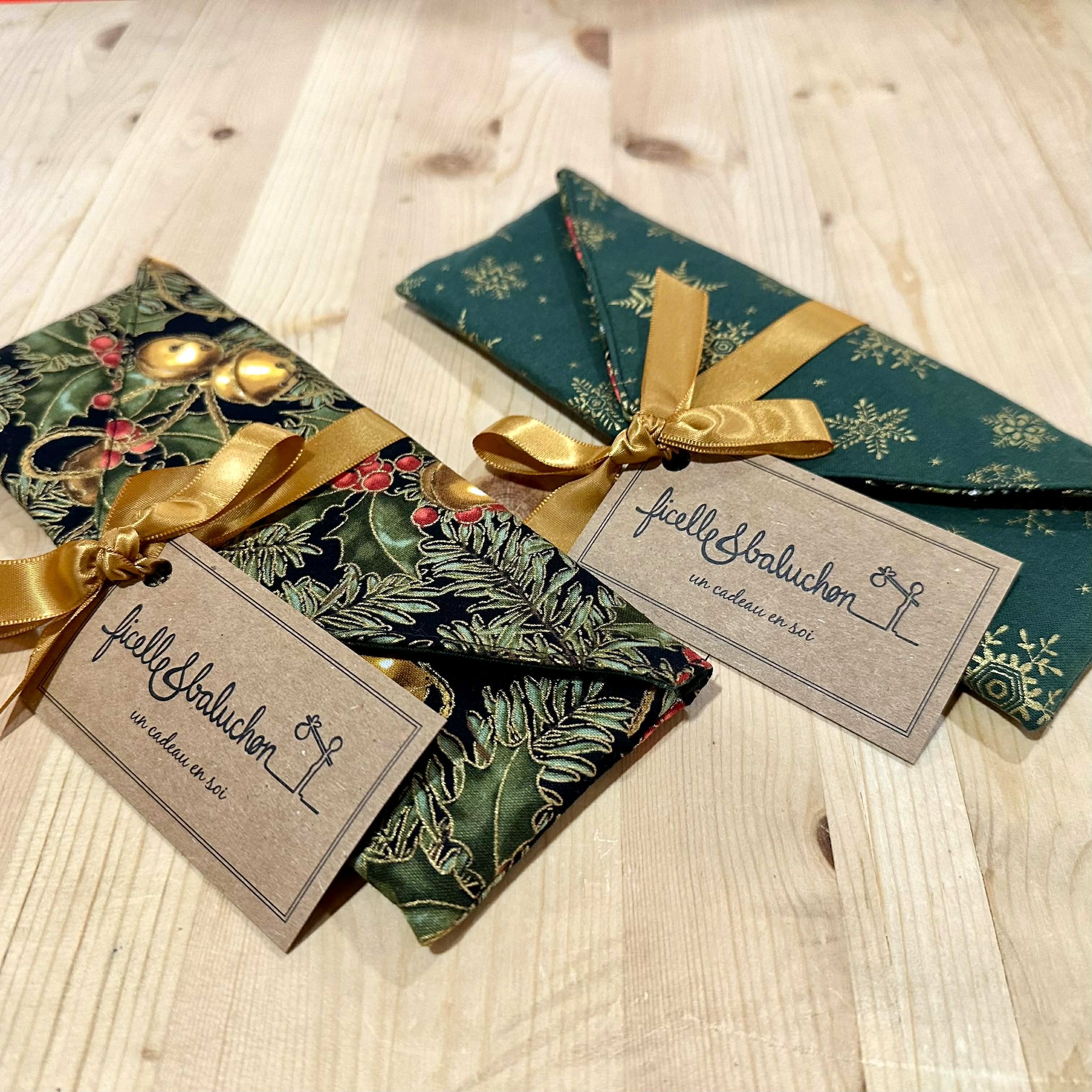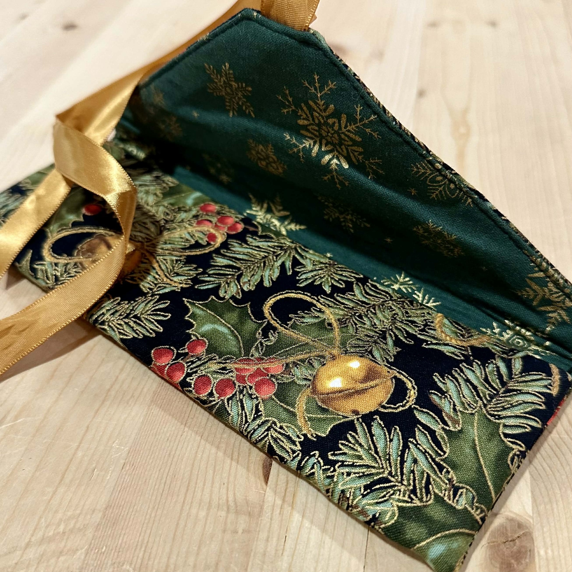 This reversible fabric envelope features a Christmas bells, mistletoe leaves and fir branches pattern on a black background and on the other, a gold snowflakes pattern on a forest green background. It measures 9 by 3 1/2 inches*. You can therefore easily slip a check, cash or a gift card inside.