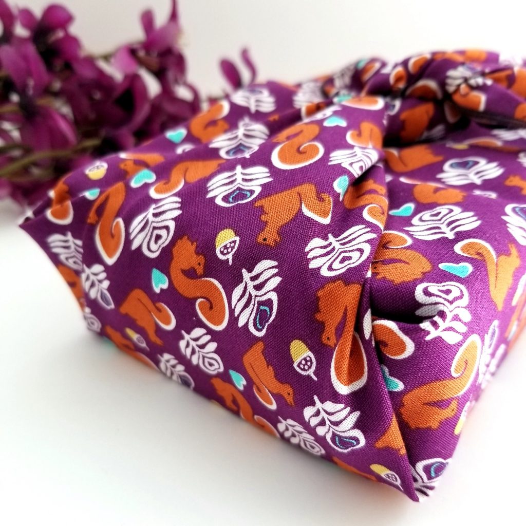 This small furoshiki features a pattern of small squirrels on a purple background. It measures 20 by 20 inches*. It can therefore easily pack the equivalent of two paperback novels or a coffee mug.